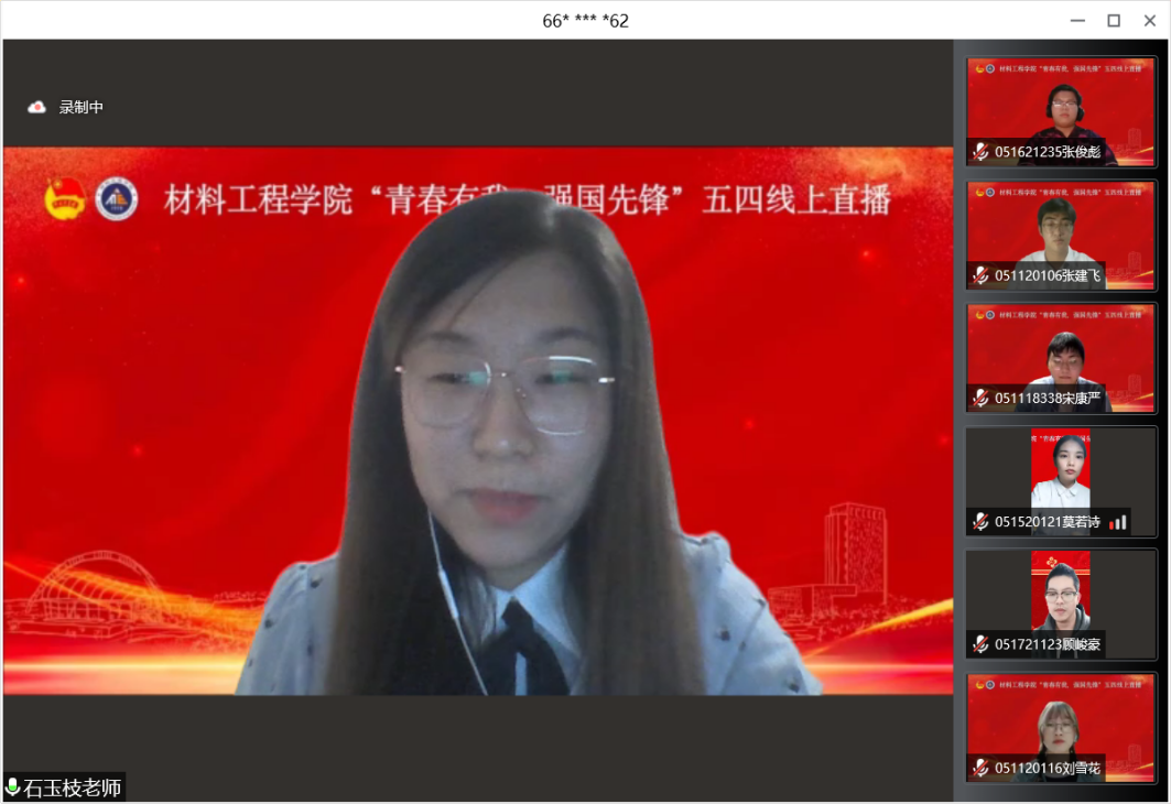 今年是中国共产主义青年团成立100周年,5月4日,材料工程学院团委于腾讯会议举办“强国先锋,青春有我”庆祝建团100周年线上直播活动。学院党委副书记黄中子老师、院团委书记石玉枝老师与全院320余名团员青年一起共度节日。活动由院团委组织部郭胤君和胡家豪同学主持。
