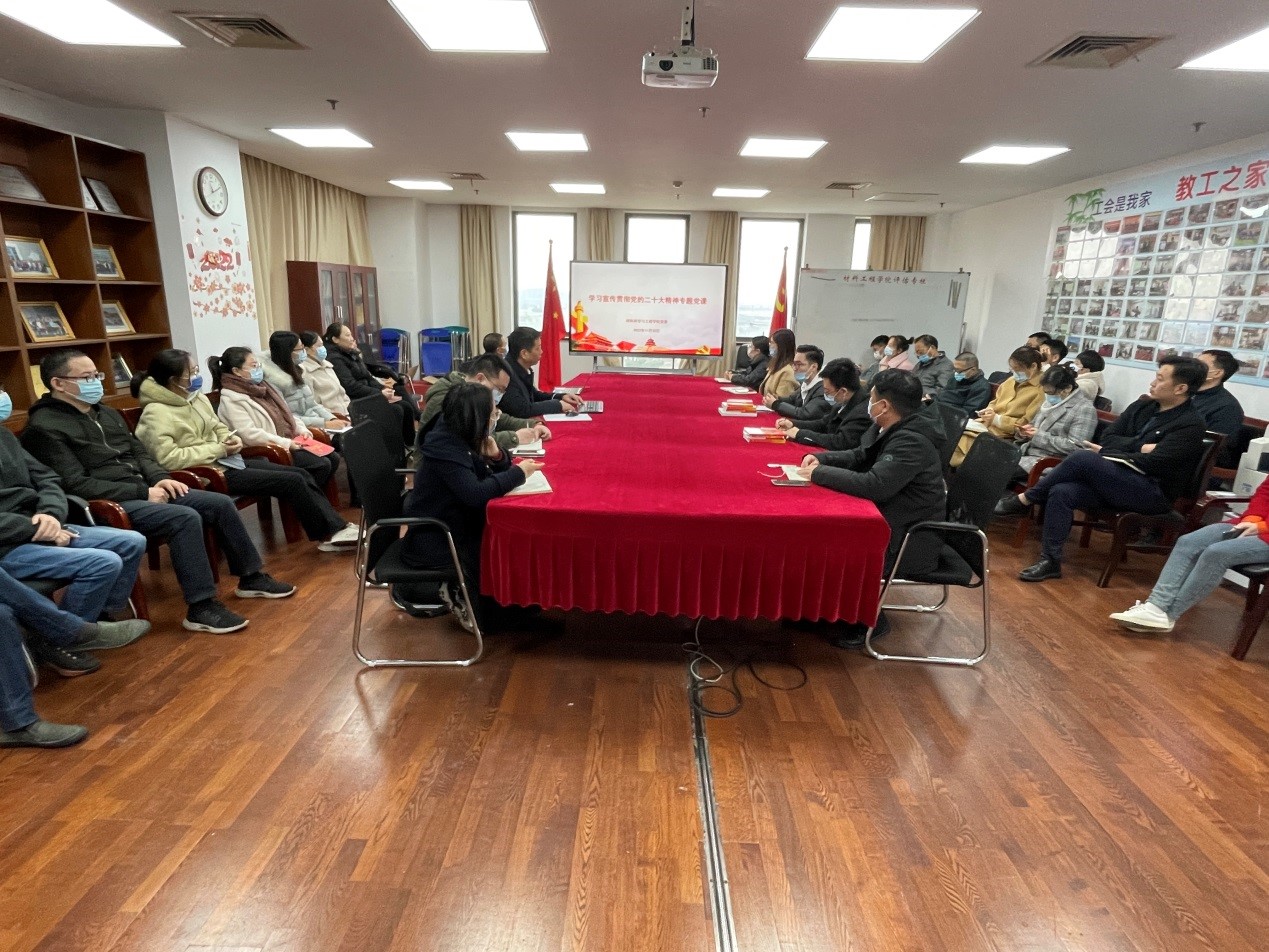 张朝民书记对党的二十大的概况、精神、主要内容和重大意义等方面进行了详细的解读。会议强调,中国共产党第二十次全国代表大会,是在全党全国各族人民迈上全面建设社会主义现代化国家新征程、向第二个百年奋斗目标进军的关键时刻召开的一次十分重要的大会,是一次高举旗帜、凝聚力量、团结奋进的大会。大会高举中国特色社会主义伟大旗帜,坚持马克思列宁主义、毛泽东思想、邓小平理论、“三个代表”重要思想、科学发展观,全面贯彻习近平新时代中国特色社会主义思想,分析了国际国内形势,提出了党的二十大主题,回顾总结了过去5年的工作和新时代10年的伟大变革,阐述了开辟马克思主义中国化时代化新境界、中国式现代化的中国特色和本质要求等重大问题,对全面建设社会主义现代化国家、全面推进中华民族伟大复兴进行了战略谋划,对统筹推进“五位一体”总体布局、协调推进“四个全面”战略布局作出了全面部署。张书记强调,一是要将学习宣传贯彻党的二十大精神作为当前和今后的首要政治任务,要在全面学习、全面把握、全面落实上下功夫,教育引导广大师生党员读原著,悟原理,将党的二十大精神统一到思想和行动上来。二是学院党委要认真组织,周密部署,分层次重点开展学习宣传活动,迅速掀起学习宣传热潮。三是要结合学院发展,贯彻党的教育方针,落实立德树人根本任务,培养德智体美劳全面发展的社会主义建设者和接班人,以博士点建设为抓手,推动学院高质量发展。